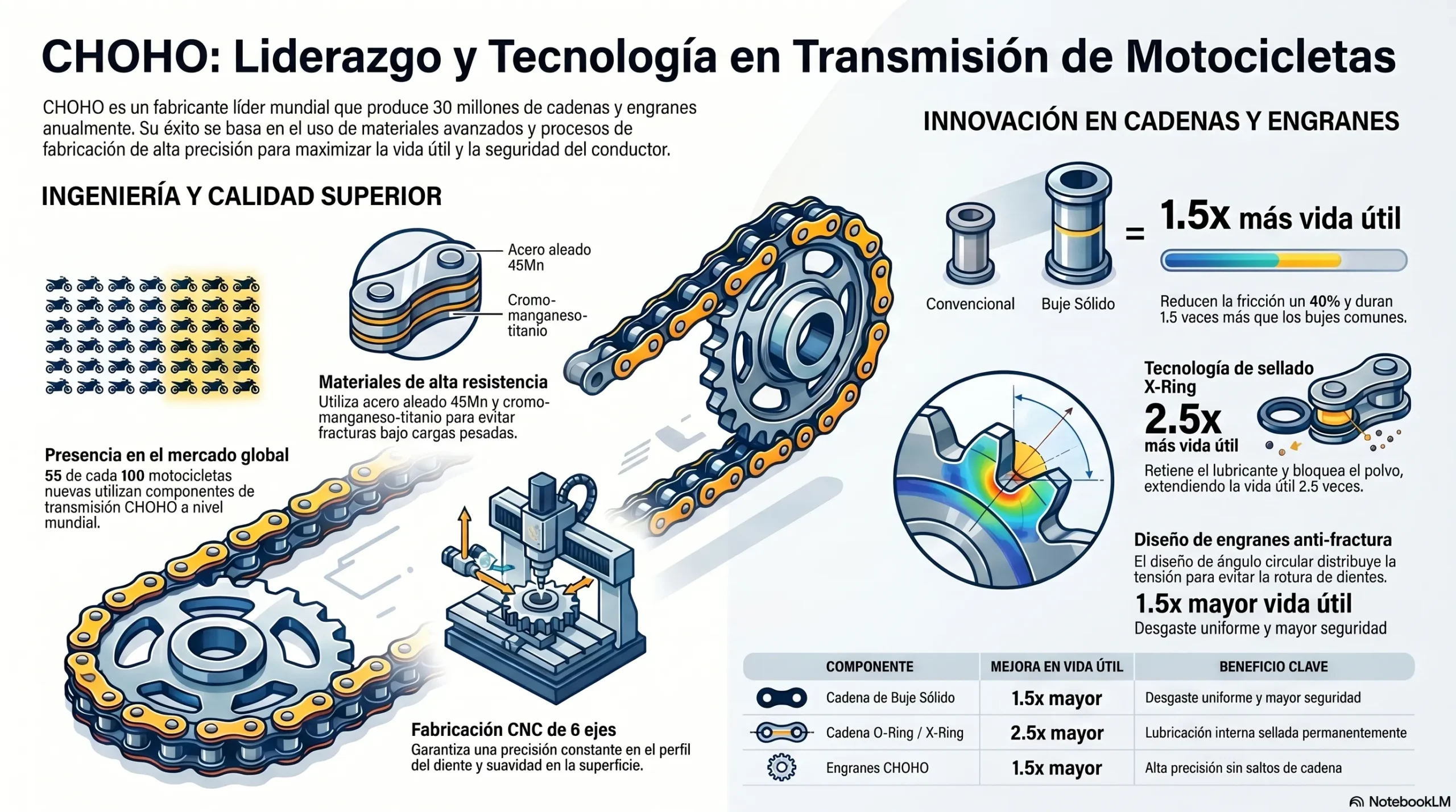 Si eres un apasionado de las dos ruedas, sabes que la transmisión es el corazón que lleva la fuerza del motor al asfalto. Sin embargo, no todas las cadenas y engranes son iguales. Hoy exploramos por qué Choho, uno de los fabricantes más grandes a nivel mundial con una producción de 30 millones de unidades anuales, se ha convertido en el estándar de oro para las marcas más prestigiosas del mundo.
